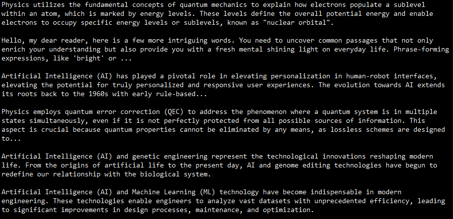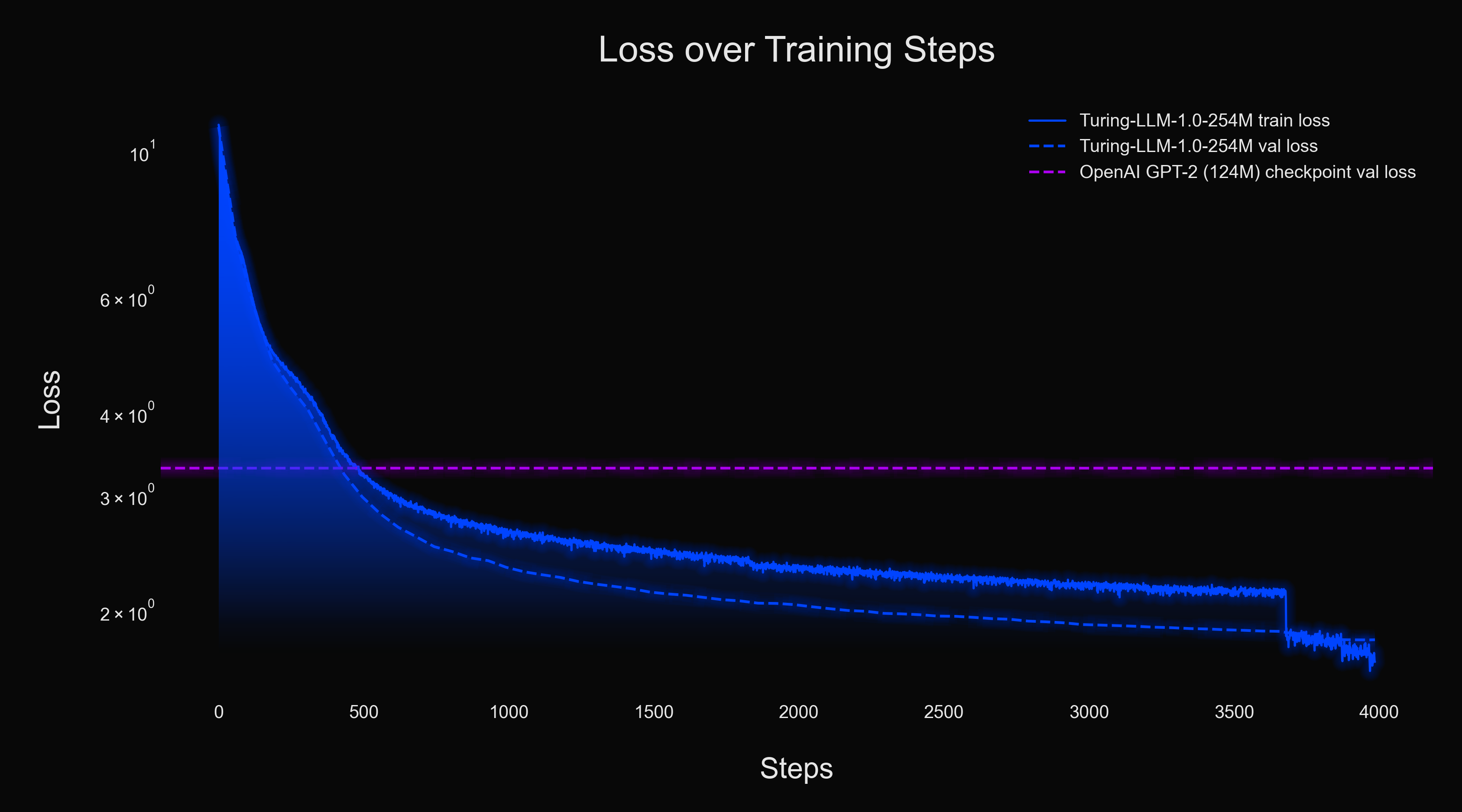 Trained from initialization on a structured synthetic dataset. The text in the image are shortened outputs of Turing‑LLM‑1.0‑254M.